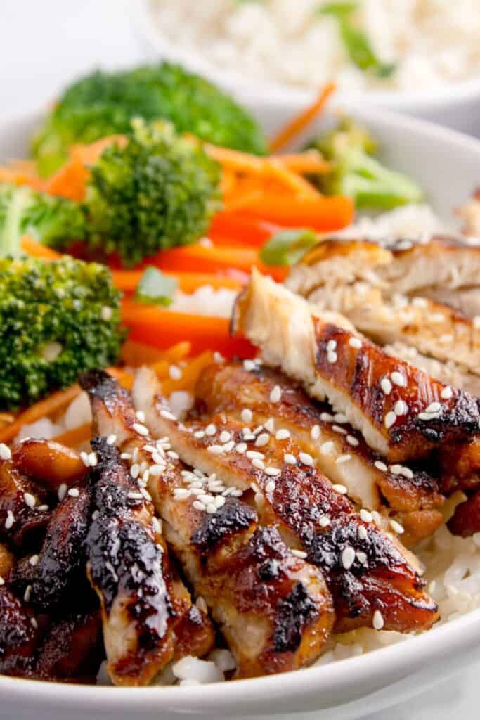 As mentioned, all of the components of the bowls will keep for about 3 days in the fridge, or up to 2 months in the freezer. It’s best to store them separately to maintain their textures. I like to reheat the chicken, veggies, and rice in a skillet over medium-low. Feel free to add a splash of water to the teriyaki sauce to liven it back up.