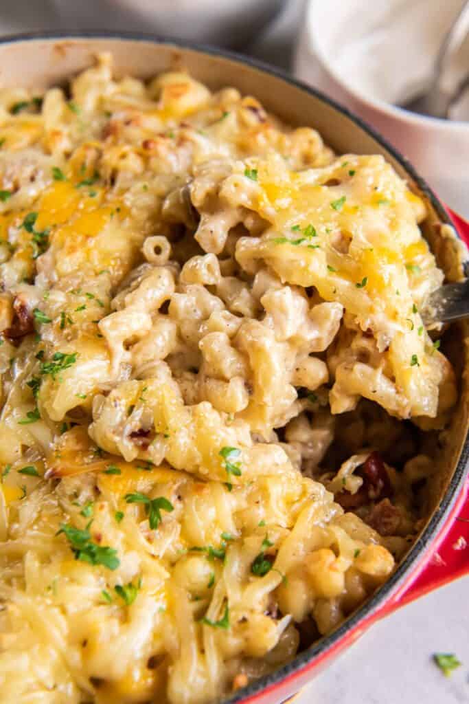 I’ve made bacon mac and cheese every possible way: in the oven, on the stovetop, even in the slow cooker. But if I need to make a big batch or transport it somewhere, this Dutch oven method is hands down one of my favorites!