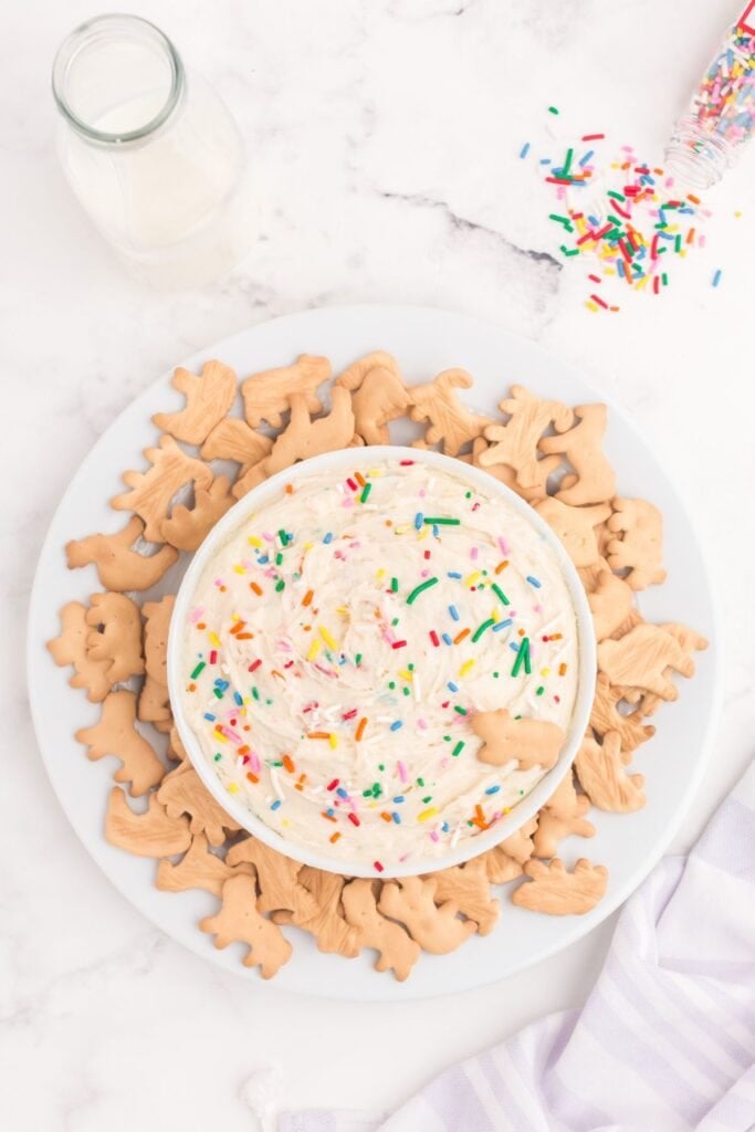 Crackers are my kids’ top picks for dipping when it comes to this dessert dips. Connor always reaches for animal crackers, while my daughter, Leah, prefers graham crackers… especially the honey or cinnamon kind. Fresh fruit or vanilla wafers also taste amazing with this sweet funfetti dip recipe, and they’re both a little tamer for adult palates!